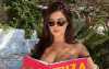 Модель спустила бретельки купальника, которые видны на ее предплечье. Роуз так прикрылась книгой, что складывается впечатление, будто модель полностью обнажена.